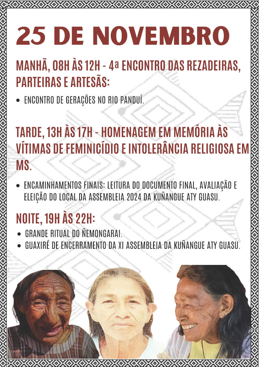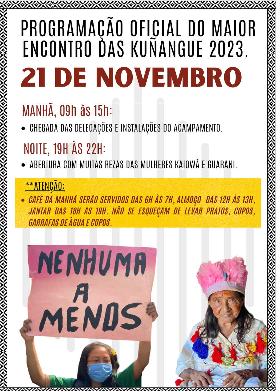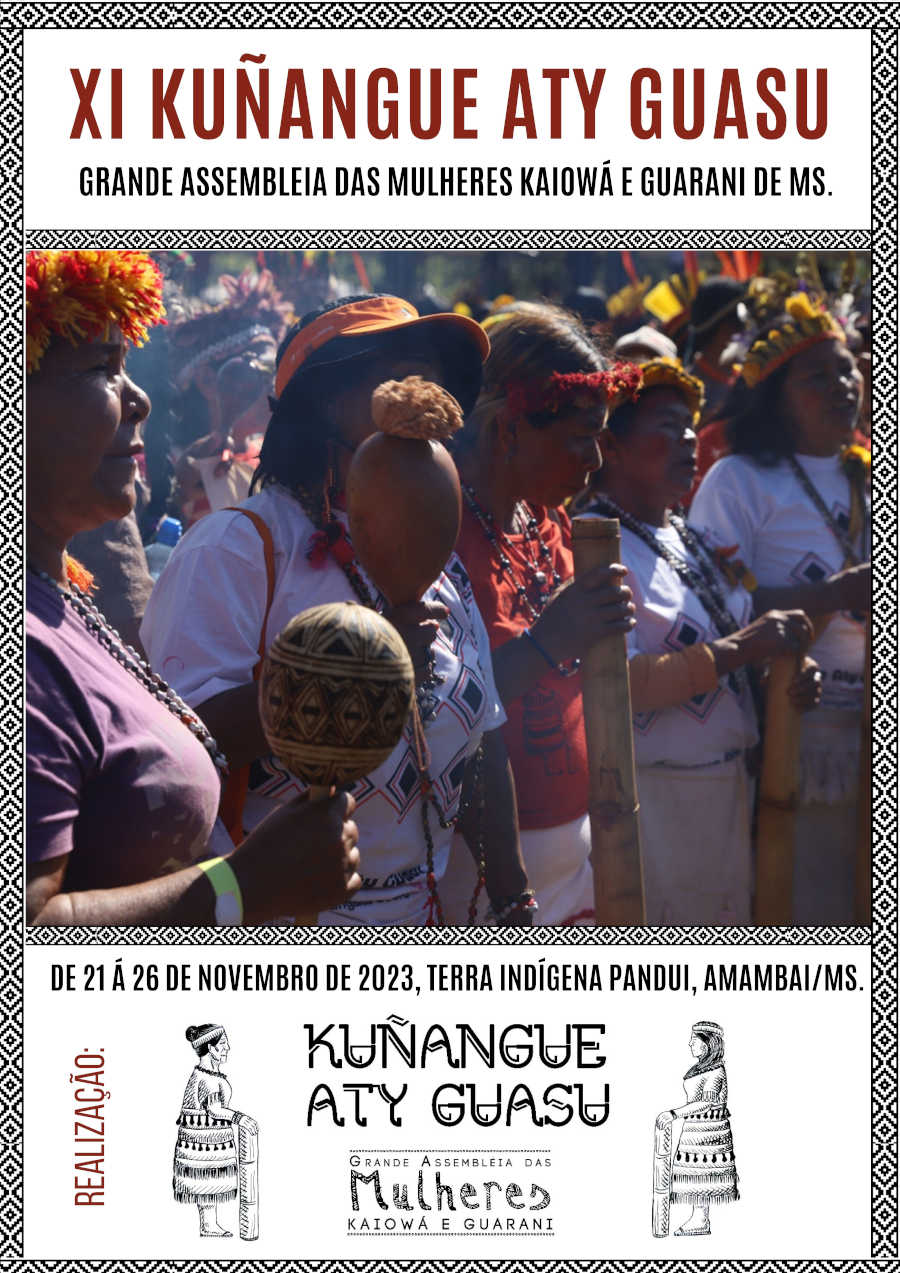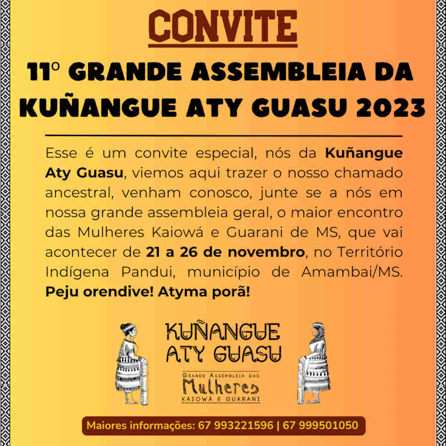 Nós da Kuñangue Aty Guasu (Grande Assembleia Das Mulheres Kaiowá e Guarani/MS), viemos aqui trazer o nosso chamado ancestral, para que se juntem a nós, venham para o nosso maior encontro das Mulheres Kaiowá e Guarani de Mato Grosso Do Sul, a nossa 11º Grande Assembleia Kuñangue Aty Guasu, vai acontecer de 21 a 26 de novembro de 2023, na Terra Indígena Panduí, em Amambai/MS.