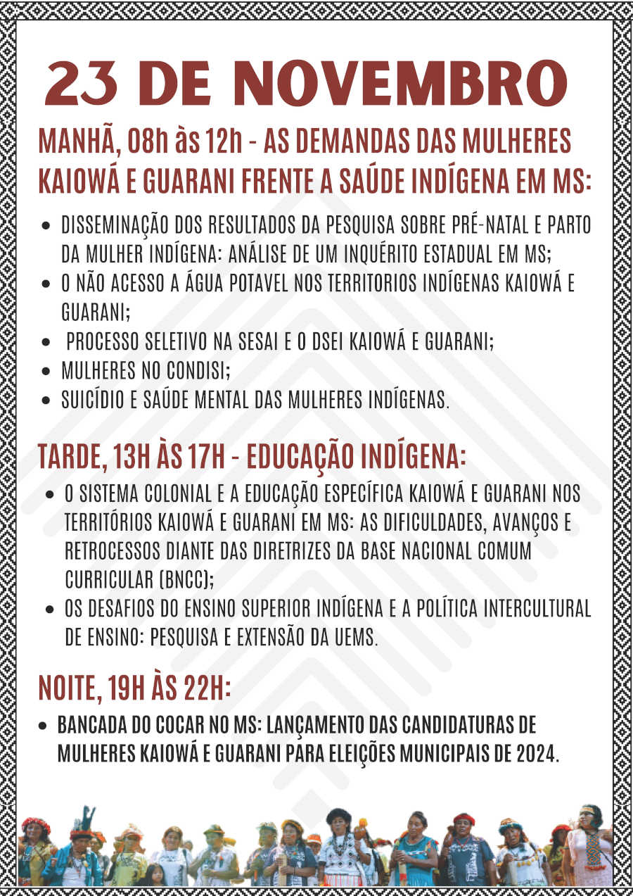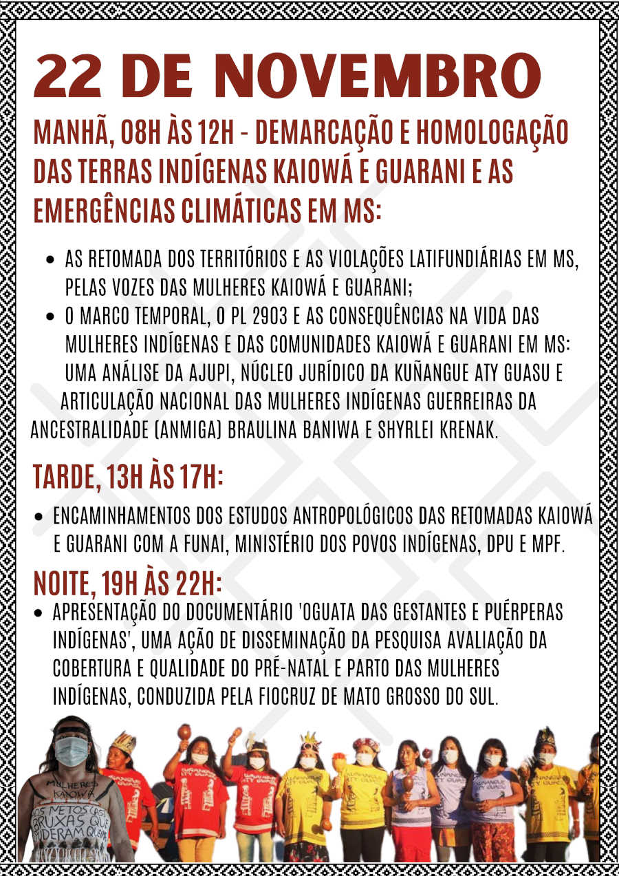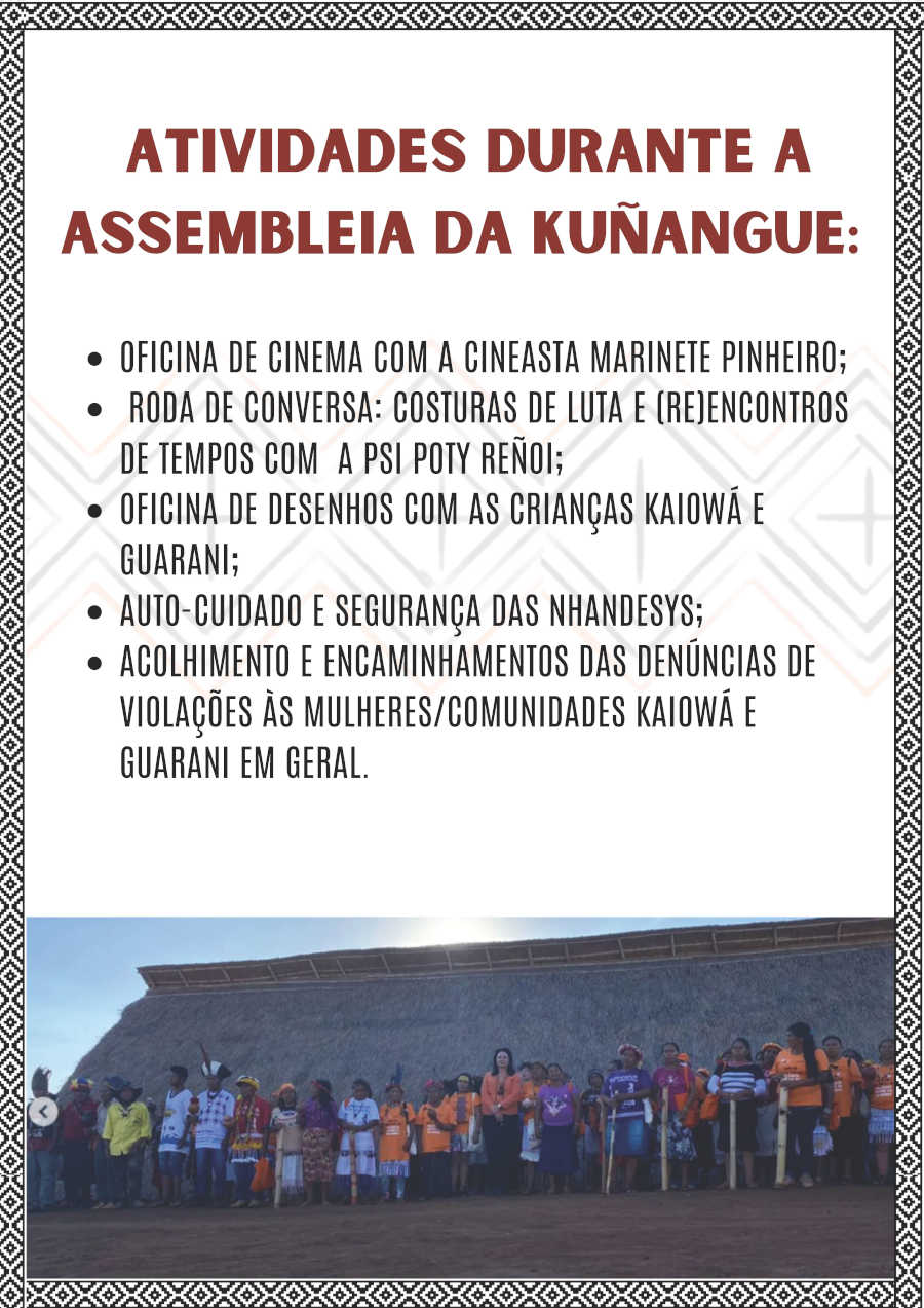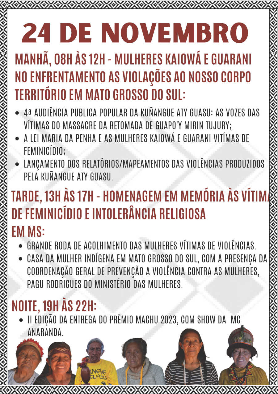 Nós da Kuñangue Aty Guasu (Grande Assembleia Das Mulheres Kaiowá e Guarani/MS), viemos aqui trazer o nosso chamado ancestral, para que se juntem a nós, venham para o nosso maior encontro das Mulheres Kaiowá e Guarani de Mato Grosso Do Sul, a nossa 11º Grande Assembleia Kuñangue Aty Guasu, vai acontecer de 21 a 26 de novembro de 2023, na Terra Indígena Panduí, em Amambai/MS.