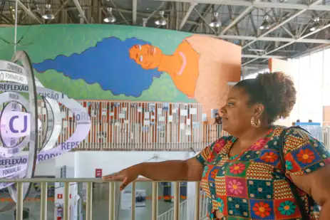 Soberana Ziza: Sim, as mulheres são sempre as protagonistas do meu trabalho. São como se fossem as condutoras dessas novas histórias. Nos meus murais, elas sempre ganham esse protagonismo. A gente está vendo aqui, esse início dessa mulher [aponta para os murais do CCJ], e na outra ponta a gente tem uma outra mulher. É como se fosse uma mulher [que] inicia uma fala, a gente tem a gestação desse debate, dessa história, a gente reconstrói essa história e inicia novamente essa história.