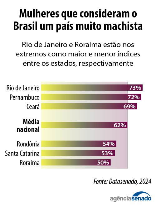 A pesquisa aponta que a percepção feminina majoritária (62%) é a de que o Brasil é um país “muito machista”. Esse índice é maior nos estados do Rio de Janeiro (73%), de Pernambuco (72%), do Ceará (68%) e no Distrito Federal (69%). Amazonas (55%), Rio Grande do Sul (55%), Rondônia (54%), Santa Catarina (53%) e Roraima (50%) ficaram abaixo da média nacional. Os demais estados apresentaram valores estatísticos próximos da média.