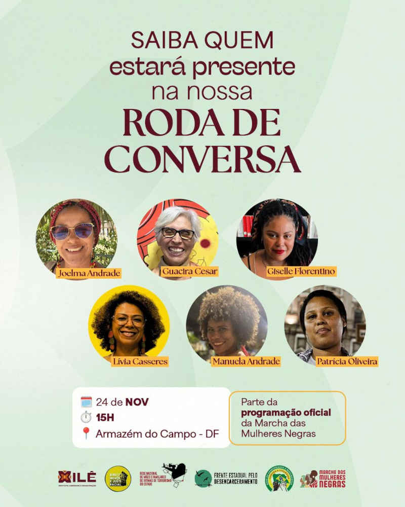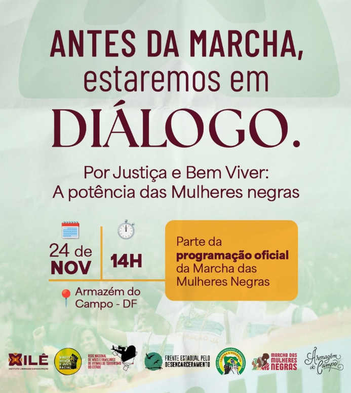 HOJE, 24 de novembro às 14h, no Armazém do Campo (SCS - Ed. Denasa - térreo), o ILÊ, Frente Estadual pelo Desencarceramento, IDMJR e Rede Nacional de mães e familiares vítimas do terrorismo do Estado promovem uma roda de conversa como parte da programação oficial da Marcha das Mulheres Negras, para refletir sobre os caminhos da reparação e do Bem Viver, ao questionar que isso não é possível sem justiça e liberdade.